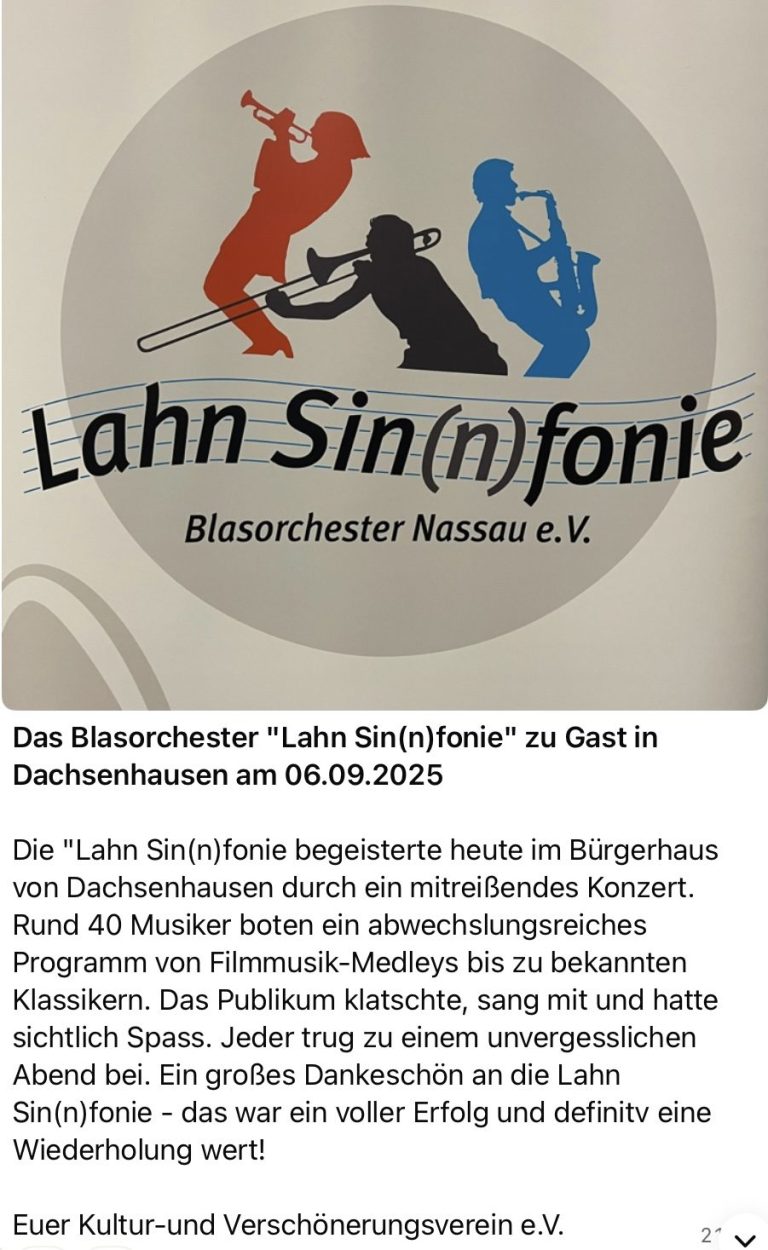 Hier finden Sie eine Zusammenstellung der Pressemitteilungen, die die Aktivitäten und Konzerte des Symphonischen Blasorchesters „Lahn Sin(n)fonie“ beleuchten. Diese Informationen bieten einen Einblick in die öffentliche Wahrnehmung und das Engagement des Orchesters in der Musikszene. Verpassen Sie nicht unsere neuesten Nachrichten, die über bevorstehende Konzerte, besondere Veranstaltungen und innovative Projekte informieren, die unser Orchester zum Leben erwecken. Besuchen Sie regelmäßig diese Seite, um über alle aktuellen Entwicklungen und Erfolge unseres Orchesters informiert zu bleiben.